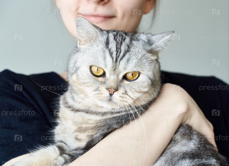 Милый полосатый кот на руках неузнаваемой женщины, дружба между людьми и домашними животными