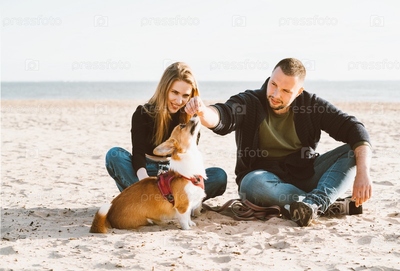 Молодая счастливая пара мужчина и женщина с собакой корги сидят на песке. Два человека, самец кормит домашнее животное