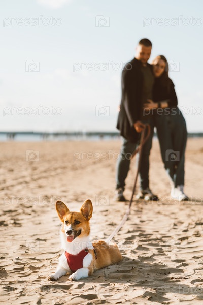 Счастливая пара гуляет по пляжу с собакой. Женщина и мужчина стоят на песке