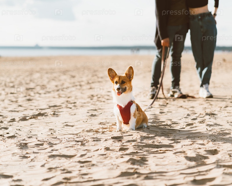 Обрезанное изображение романтической пары, гуляющей по пляжу с собакой