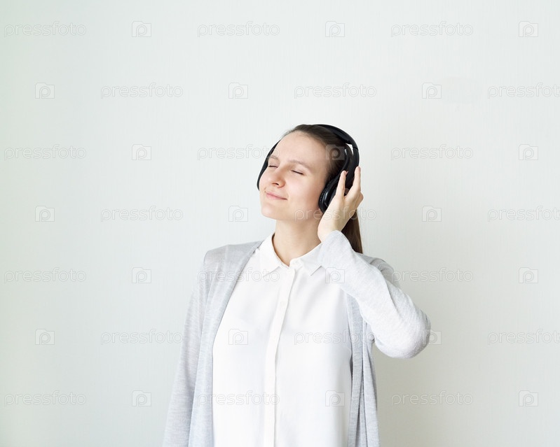 Молодая женщина слушает музыку в наушниках, девушка стоит перед светло-серой стеной