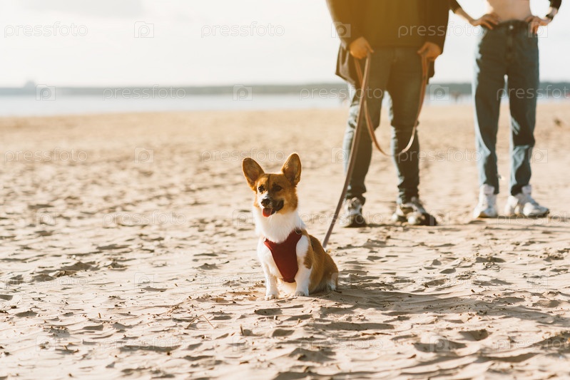 Обрезанное изображение людей, гуляющих по пляжу с собакой. Ноги женщины и мужчины стоят на песке