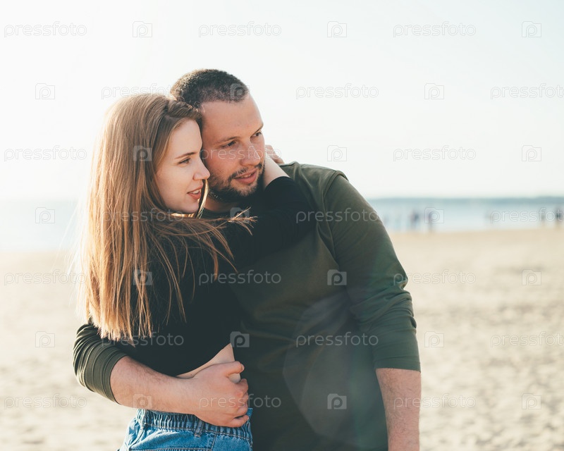 Молодая взрослая пара стоит на берегу, обнимает друг друга и смотрит на кого-то. Красивый улыбающийся мужчина обнимает красивую улыбающуюся женщину. Копировать пространство