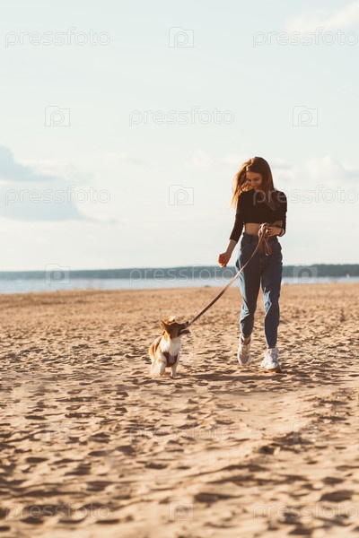 Красивая молодая женщина и щенок корги бегут по пляжу. Улыбающаяся женщина гуляет с собакой