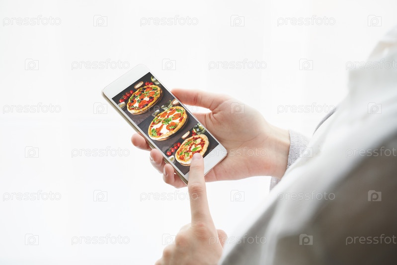 Неузнаваемая женщина держит сотовый телефон. Вид сзади, макет