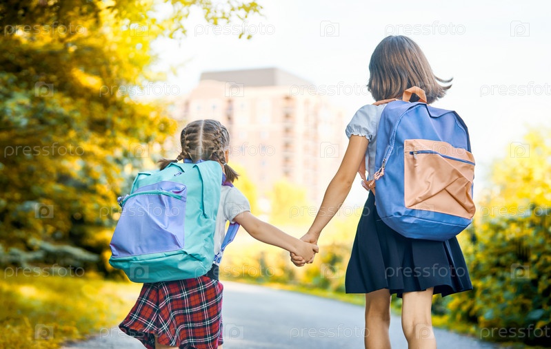Девочки с рюкзаком идут в школу