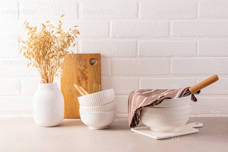 Набор белых керамических мисок для приготовления пищи на каменной кухонной столешнице. белая ваза с колосьями пшеницы. Белая кирпичная стена. минимализм