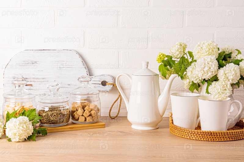 Современный кухонный фон в светлых тонах. Набор предметов для утреннего кофе на деревянной столешнице. Весенние цветущие ветки в кувшине. Передний план