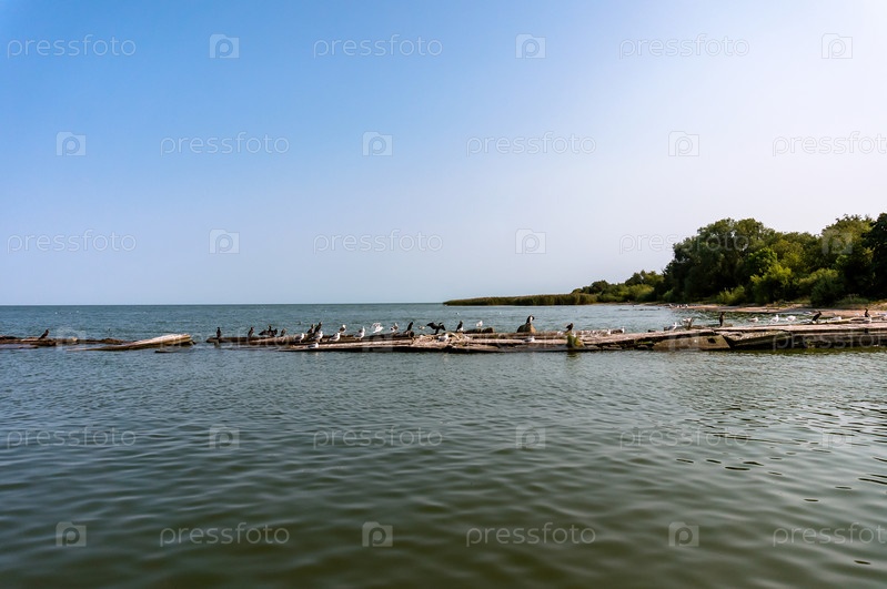 Водоплавающие птицы в морской гавани. Чайки и бакланы на берегу