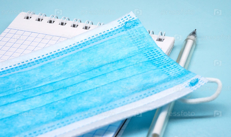 Медицинская маска и блокнот на синем фоне. Канцелярские товары и гигиеническая маска