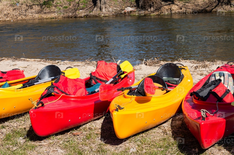 Каяк на берегу реки. Активное времяпрепровождение выходного дня. Спортивный туризм. Сплав на каяках весной. Каяки из желтого и красного пластика
