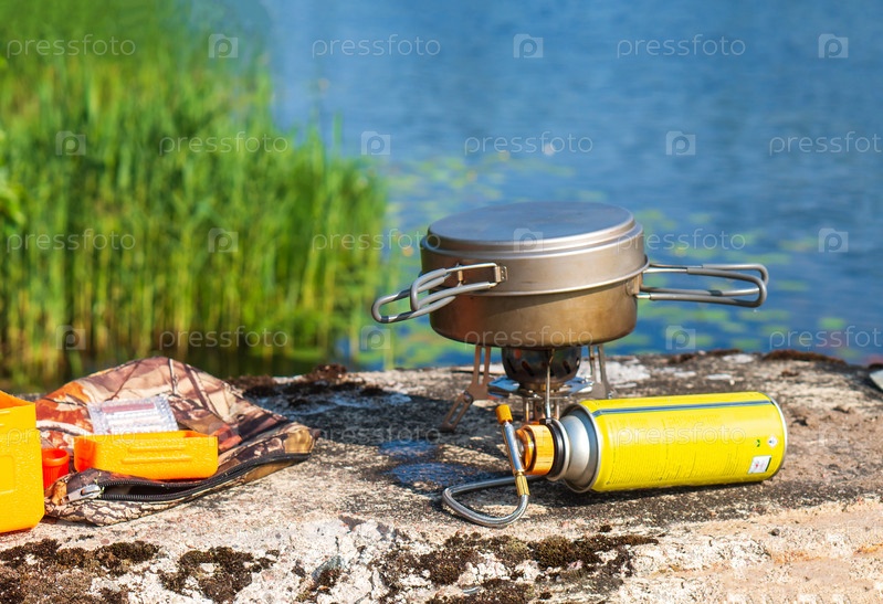 Туристическая газовая горелка. Чайник на газовой туристической горелке. Приготовление еды в походе