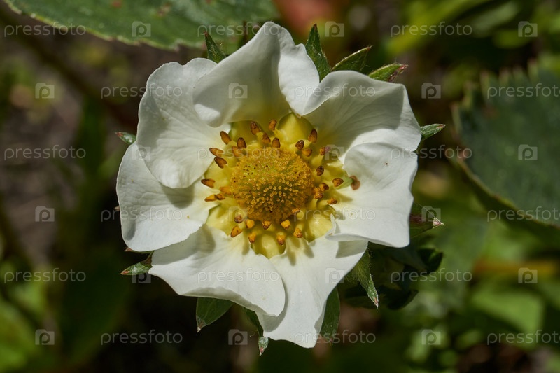 Цветы клубники на фоне листьев и земли. В саду цветет клубника
