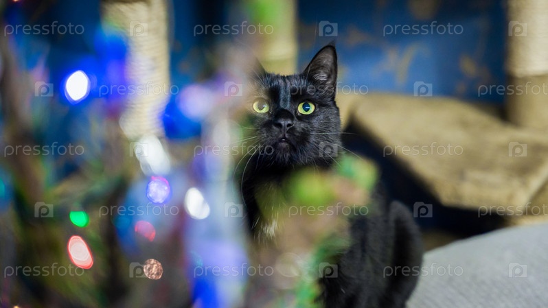 Черный кот с удивлением смотрит на елку с праздничными огнями