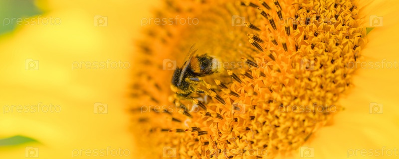 Милый мохнатый шмель сидит на подсолнухе в ясный солнечный день, позитивный образ