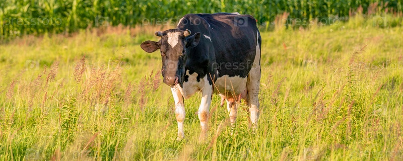 Коровы пасутся на сочном лугу в летний день