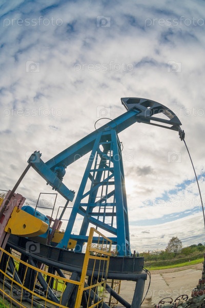 Масляный насос на фоне голубого неба и утреннего солнца, солнечные блики на масляном насосе