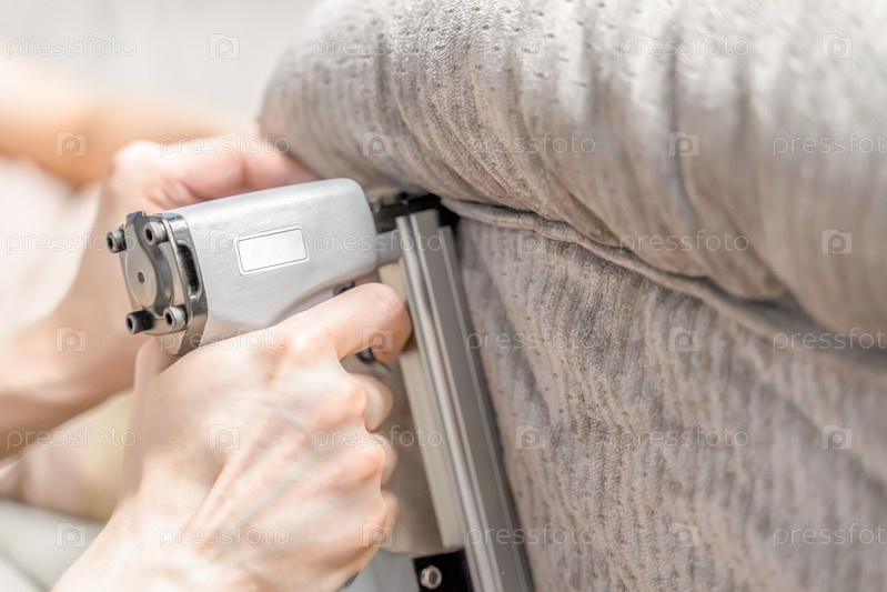 Рабочий с инструментом меняет обивку дивана, крупным планом размытый фон