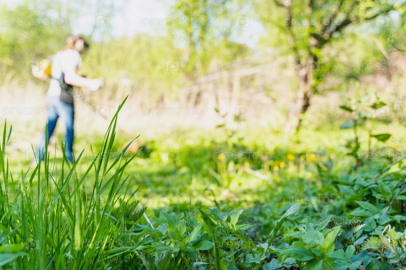 Мужчина косит траву триммером, фокусируется на размытом фоне переднего плана