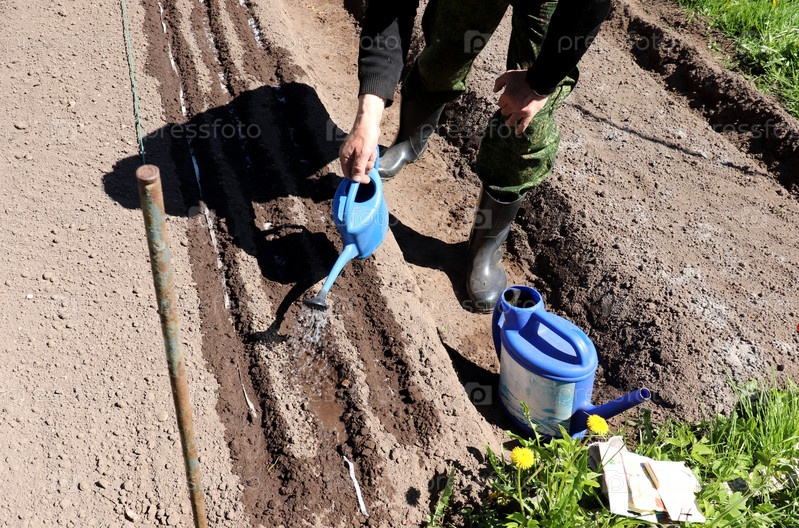 Пенсионер поливает семена моркови на грядке - вид сверху