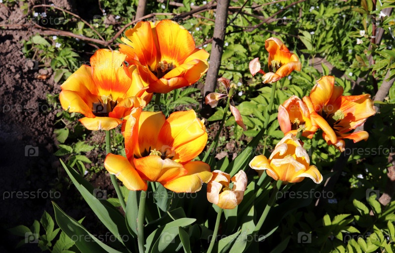 Оранжевые тюльпаны на клумбе в весенний солнечный день