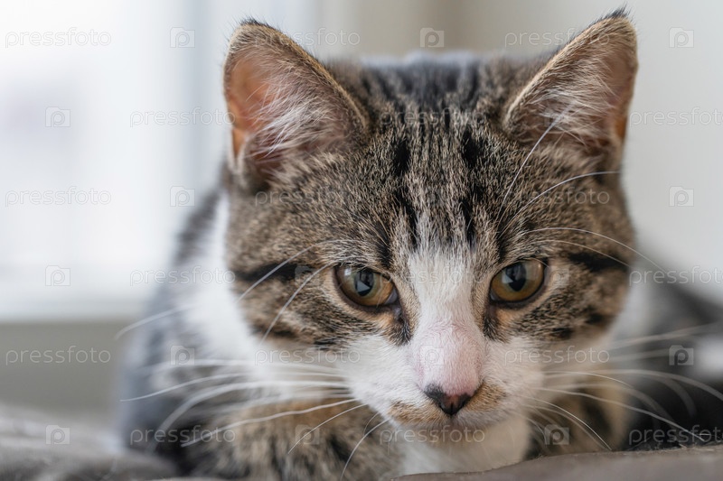 Милый молодой кот греется на солнце на подоконнике