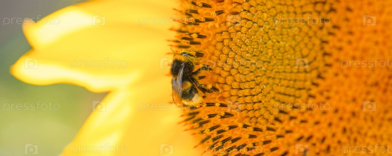 Милый мохнатый шмель сидит на подсолнухе в ясный солнечный день, позитивный образ