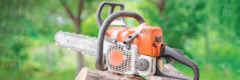 Бензопила лежит на распиленных бревнах среди зелени леса, выборочный фокус размыт фон