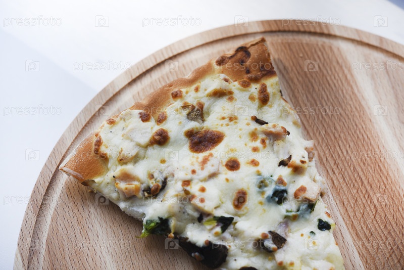 Мясная пицца на деревянной подставке. Вкусная итальянская пицца