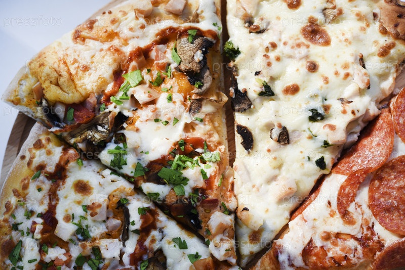 Мясная пицца на деревянной подставке. Вкусная итальянская пицца