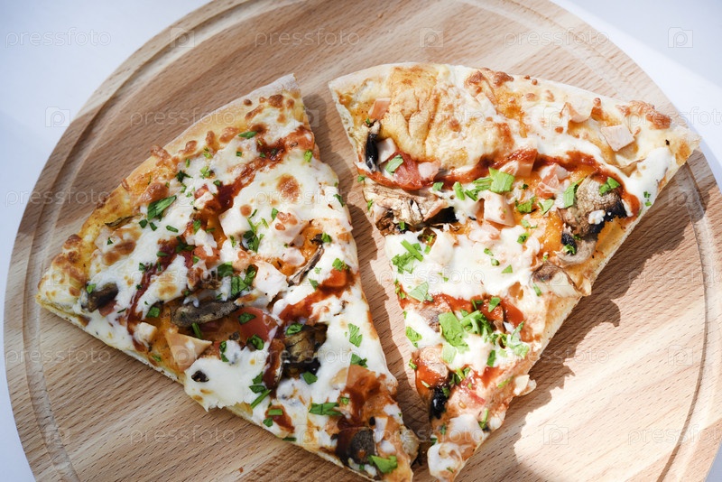Мясная пицца на деревянной подставке. Вкусная итальянская пицца