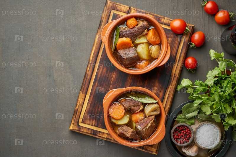 Гуляш с крупными кусочками говядины и овощами. Темно-коричневый фон. вид сверху, пространство для копирования