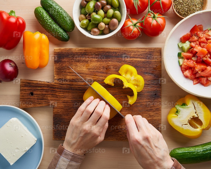 Пошаговый рецепт салата хориатики, деревянная доска для нарезки овощей и ингредиентов. Руки с ножом, режем перец