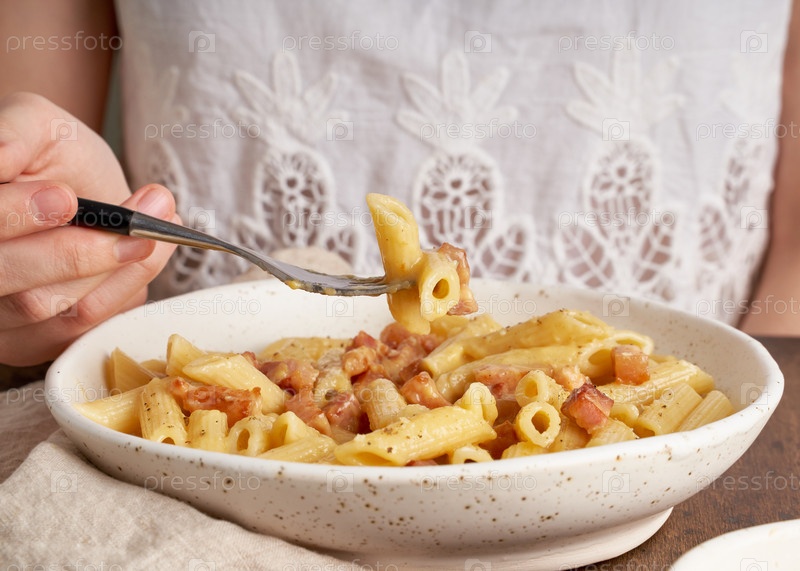 Паста Карбонара. Женщина сидит за столом и ест макароны-пенне с панчеттой