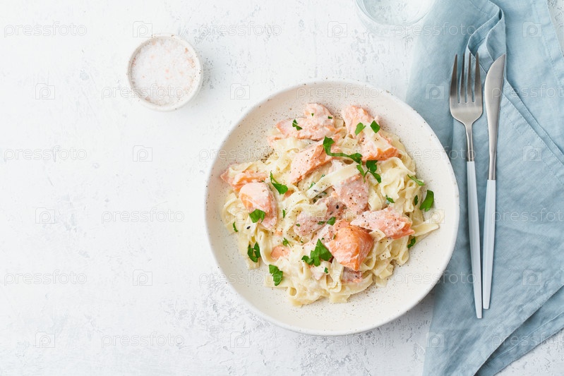Паста с лососем, тальятелле с рыбой и сливочным соусом. Итальянский ужин с морепродуктами. Белый фон, вид сверху