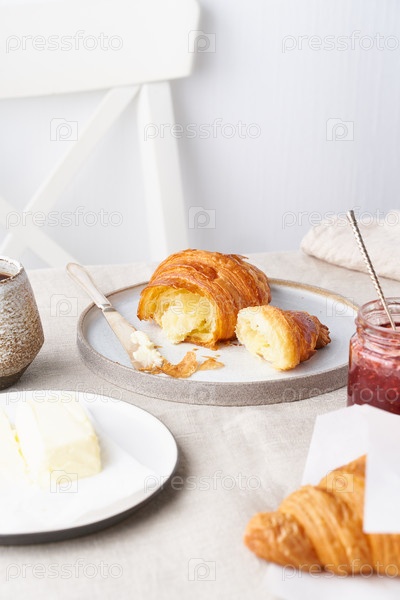 Кофе с круассаном. Традиционный французский завтрак. Яркое солнечное утро, неспешный завтрак со свежей выпечкой, маслом и джемом. Белая стена, белый стул, светлая скатерть. Вид сбоку, вертикальный