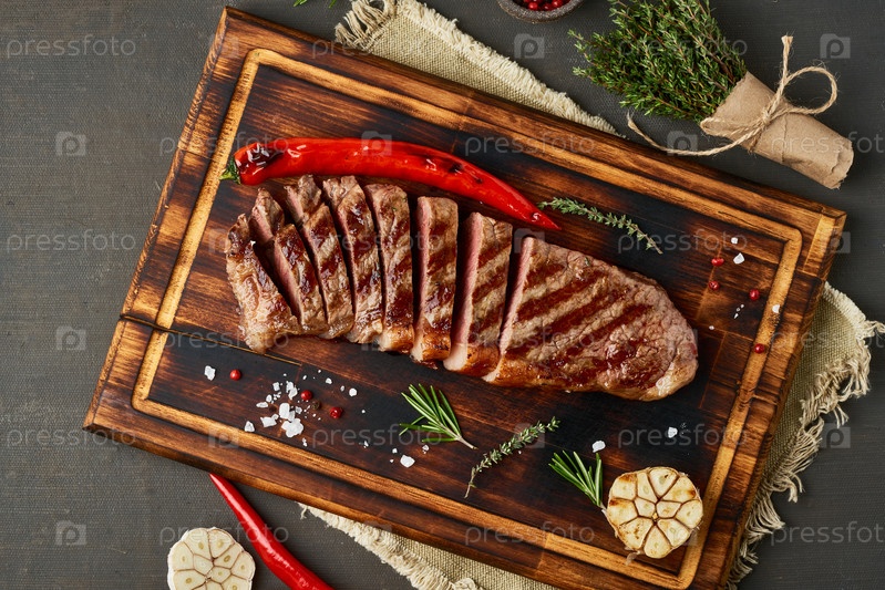 Кето-кето-диетический говяжий стейк, хорошо прожаренный жареный стриплойн на разделочной доске на темно-коричневом столе. Рецепт палео еды с нарезанным куском мяса, вид сверху, место для копирования