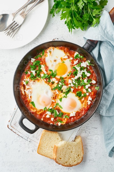 Шакшука, яичный пашот в соусе из томатов, оливкового масла, перца, лука и чеснока, средиземноморская кухня. кето блюдо, рецепт FODMAP, низкоуглеводное. вид сверху, вертикальный