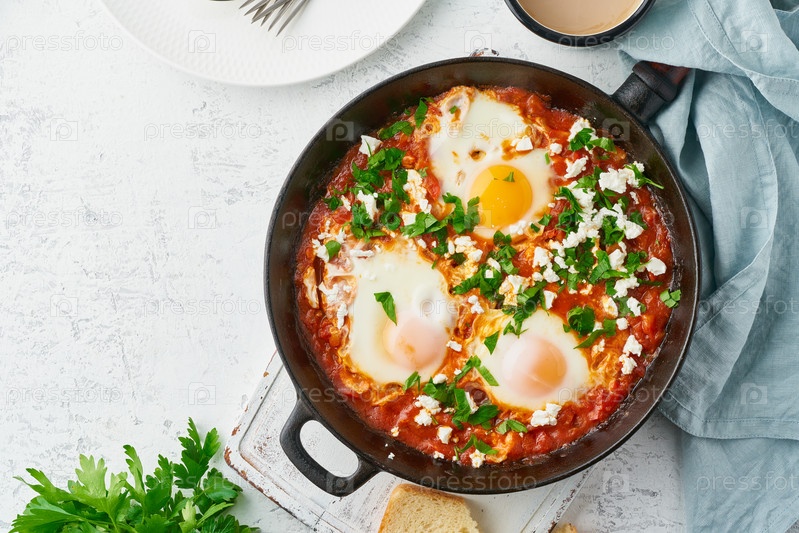 Шакшука, яйца пашот в томатном соусе, оливковое масло. Средиземноморская кухня