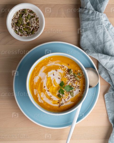 Тыквенный суп с кокосовым молоком, вегетарианское блюдо, здоровое и диетическое питание на деревянном фоне, вид сверху, вертикальный