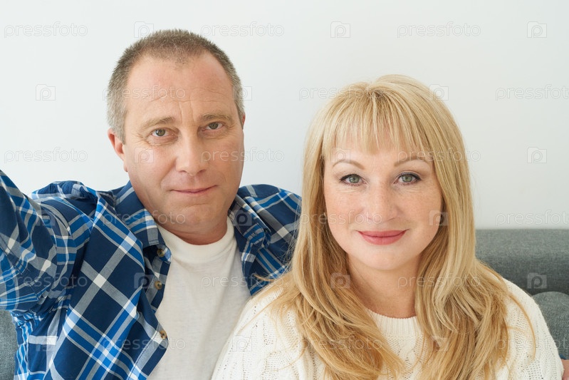 Автопортрет зрелой пары в домашнем интерьере на диване. Красивый мужчина и привлекательная женщина средних лет любят проводить время вместе, делая селфи