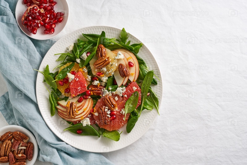 Фруктово-цитрусовый салат с орехами, листьями зеленого салата. Вид сверху. Шпинат с апельсином, грейпфрутом