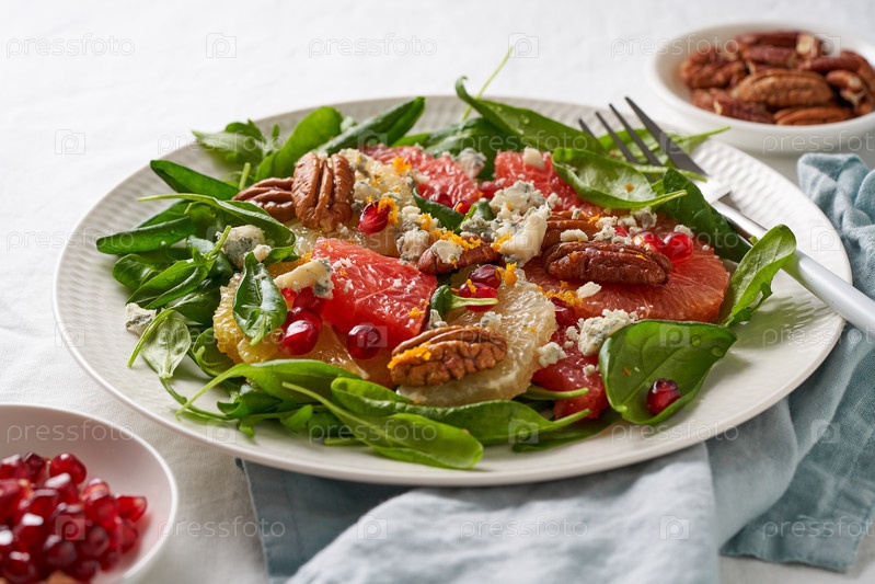 Закрыть Фруктовый цитрусовый салат с орехами, листьями зеленого салата. Сбалансированное питание. Шпинат с апельсином, грейпфрутом, орехами пекан и горгонзолой, украшенный зернами граната, вид сбоку