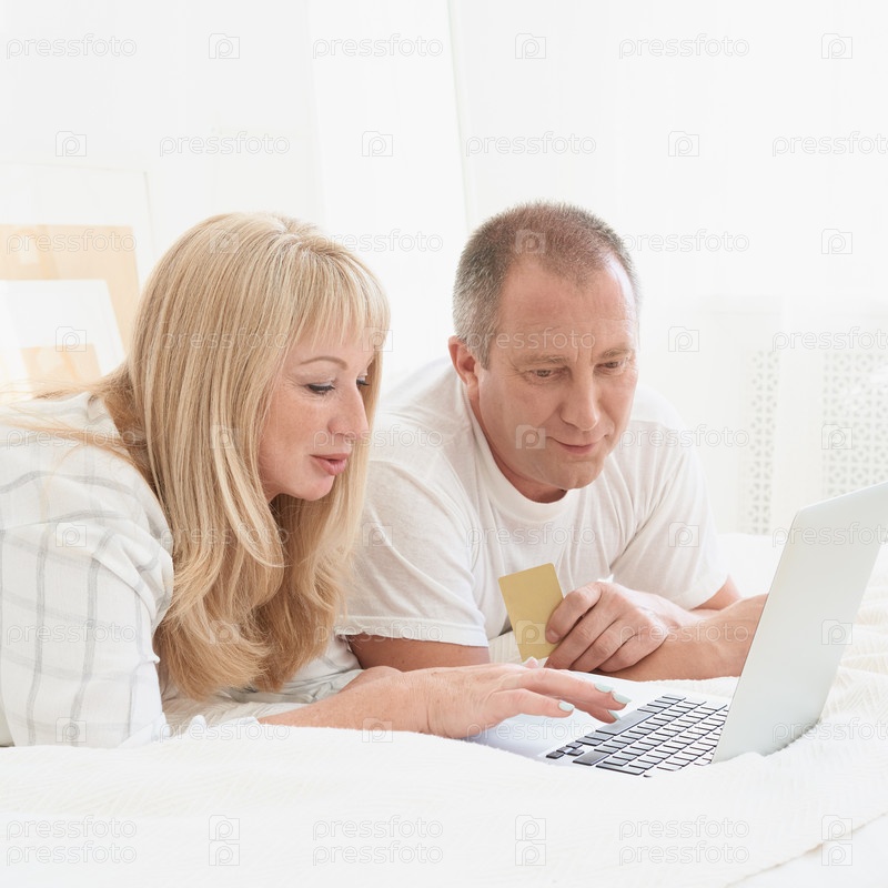 Пожилая семейная пара смотрит на экран ноутбука. Счастливый мужчина средних лет с кредитной картой