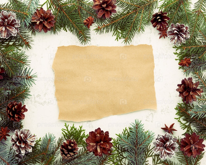 Рождество и счастливый Новый год на белом фоне с крафт-бумагой для текста. Рамка для рецепта