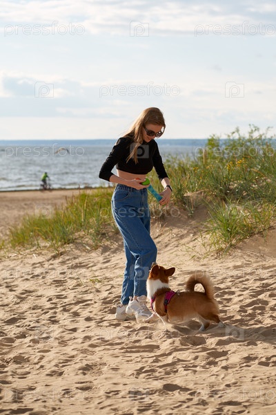 Молодая счастливая пара и собака гуляют по пляжу. Женщина играет со щенком корги на поводке. Летняя прогулка на природе с людьми и домашними животными по выходным. Красивые самки в полный рост