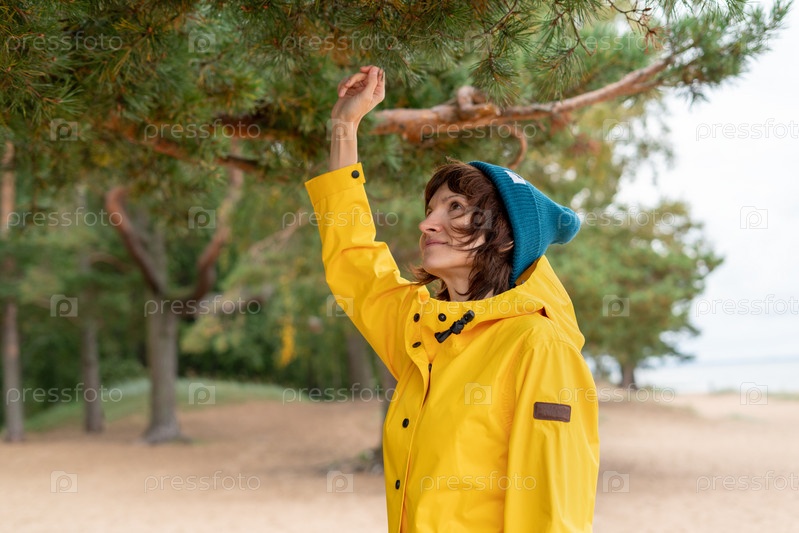 Талический портрет женщины в ярко-желтом плаще и синей шляпе, касающейся сосны на