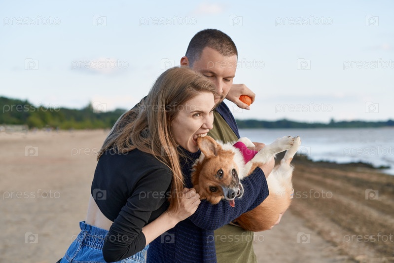 Молодая счастливая пара с собакой, стоящей на пляже. Красивая девушка кусает за ухо щенка корги