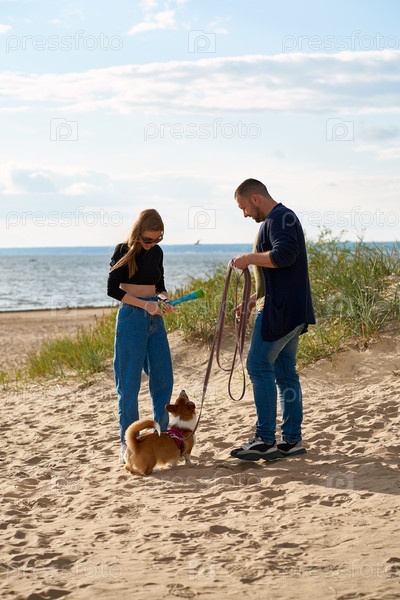 Молодая счастливая пара и собака гуляют по пляжу. Женщина играет с домашним животным игрушкой. Мужчина держит щенка корги на поводке. Летняя прогулка на природе влюбленных людей на выходных. Люди в полный рост