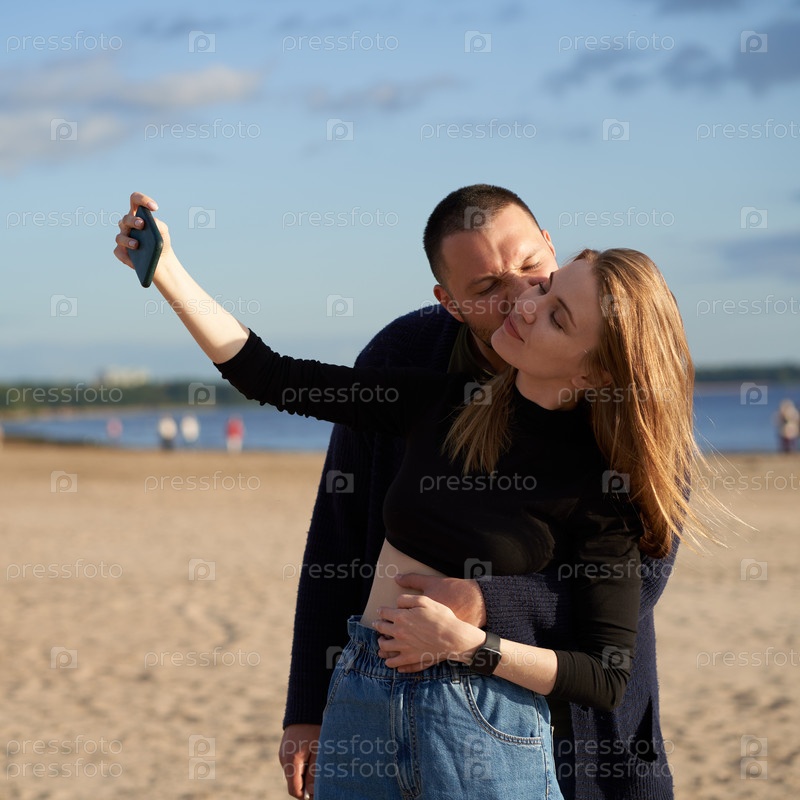 Пара веселится и делает селфи на мобильный телефон на песчаном пляже летом или осенью. Красивый мужчина кусает красивую женщину с длинными волосами